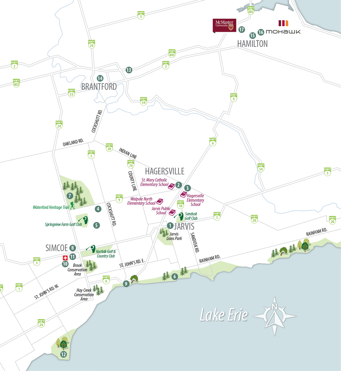 Graduates of Walpole North Elementary School and Jarvis Public School continue their education at Hagersville Secondary School, which offers a wide choice of academic courses and extra-curricular activities. From there, Wilfred Laurier University, McMaster University and Mohawk College are all 30-45 minutes away.